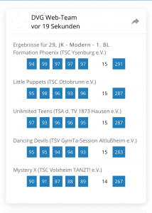 März122022AllgemeinAm Samstag war der Tag gekommen, unsere Formation Phoenix erhielt 291 Punkte und ertanzte sich somit Platz 1 Kategorie: AllgemeinVon Denise12. März 2022Kommentar hinterlassen Autor: Denise KommentarnavigationZurückVorheriger Beitrag:WE´RE BACK ON STAGE – mehr als ein gelungener SaisonauftaktNächstesNächster Beitrag:Die Schülerklasse sammelt PunkteRelated PostsRückblick 2024/25 – unsere Purzels & Trainees: Ein Jahr voller Highlights ✨3. Juli 2025Neuer Vorstand gewählt – gemeinsam in die Zukunft!30. Juni 2025Adventstanzen des TSC Ysenburg am 15.12.202419. Dezember 2024Wir erobern die Hessenmeisterschaft25. April 20242x Hessenmeister 202326. März 2023Letztes Ranglistenturnier beim TSC Bimmbär e.V. in Dreieich18. März 2023